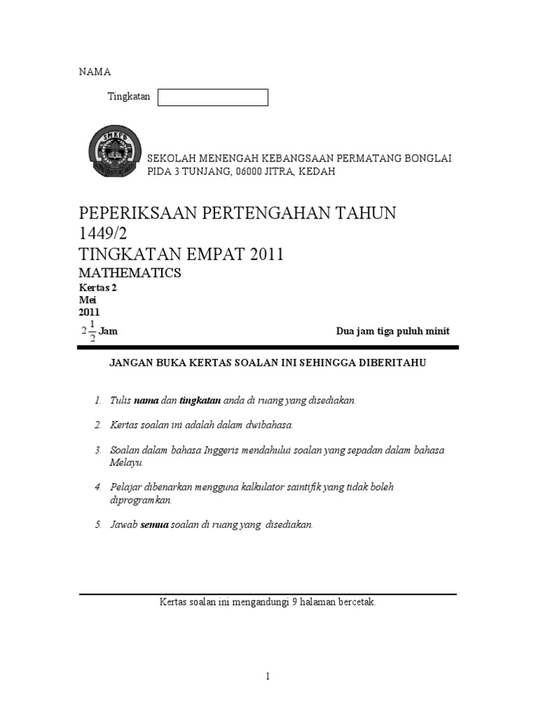 Peperiksaan Pertengahan Tahun Matematik Tingkatan 4 Kertas 2 Pdf